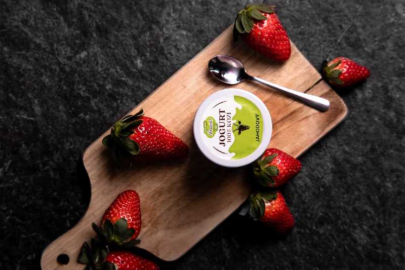 Zloženie: pasterizované kozie mlieko, ochucujúca zložka min. 15% (cukor, jahody 30%, fruktóza, škrob kukuričný bez E kódu, koncentrát čiernej mrkvy, voda, jablková dreň, aróma jahodová), jogurtová kultúra.
