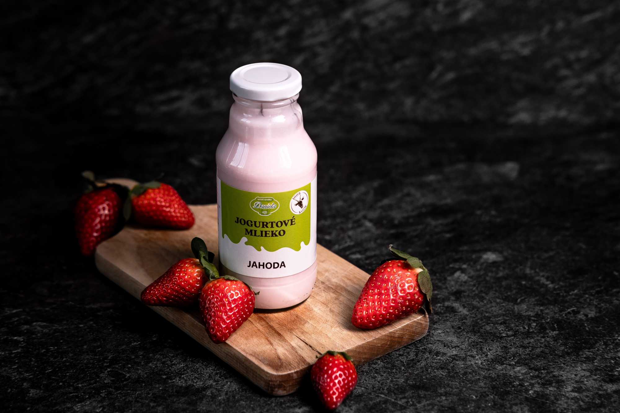 Zloženie: pasterizované kozie mlieko, ochucujúca zložka min. 15% (cukor, jahody 30%, fruktóza, škrob kukuričný bez E kódu, koncentrát čiernej mrkvy, voda, jablková dreň, aróma jahodová), jogurtová kultúra.