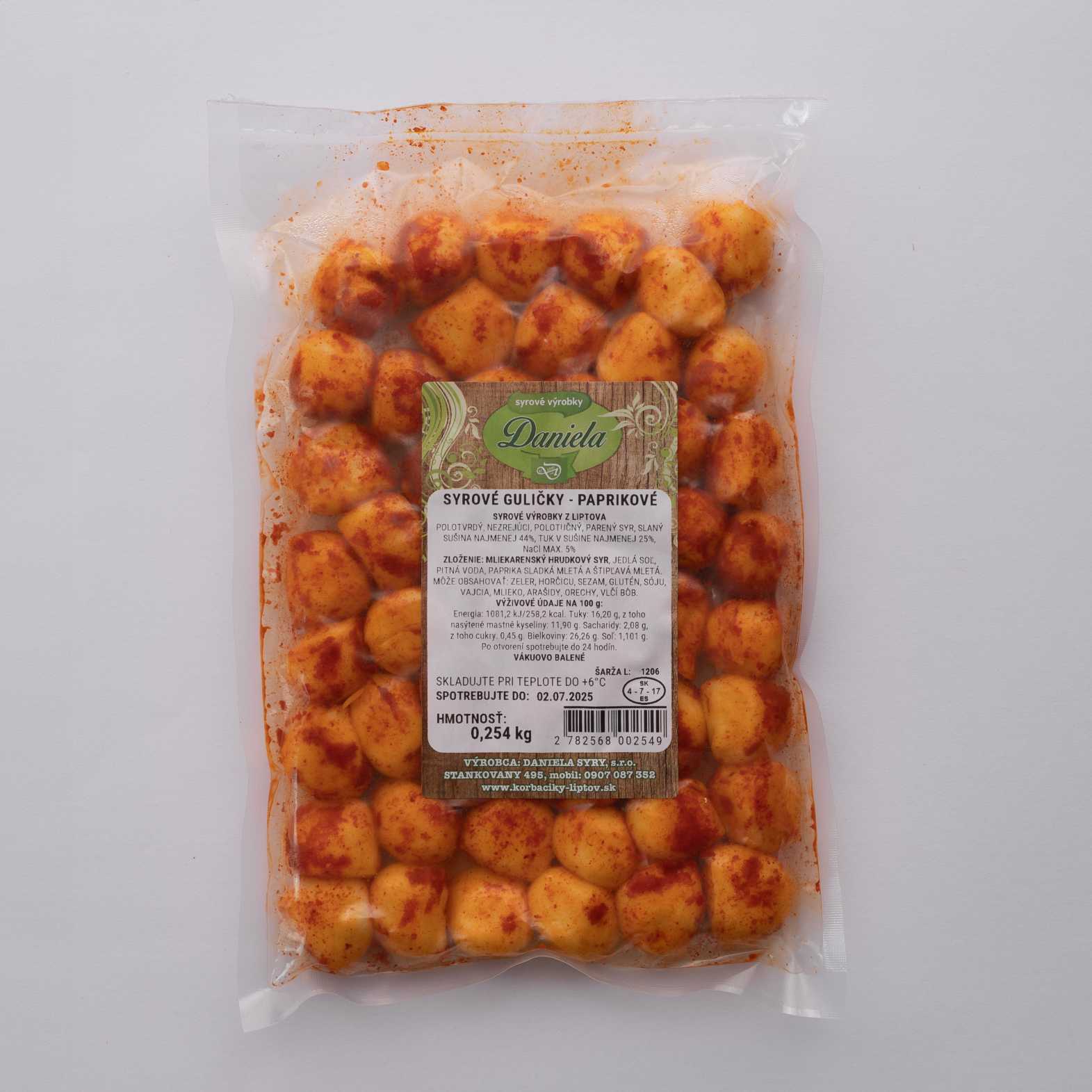 Zloženie: mliekarenský hrudkový syr, jedlá soľ, pitná voda, paprika sladká mletá a štipľavá mletá.