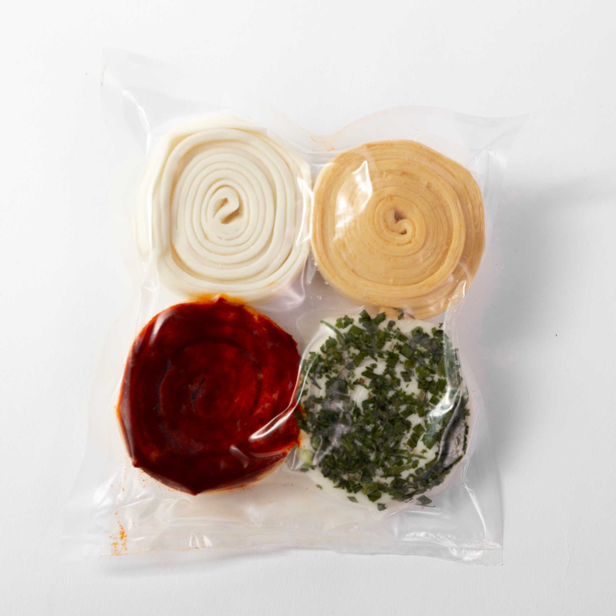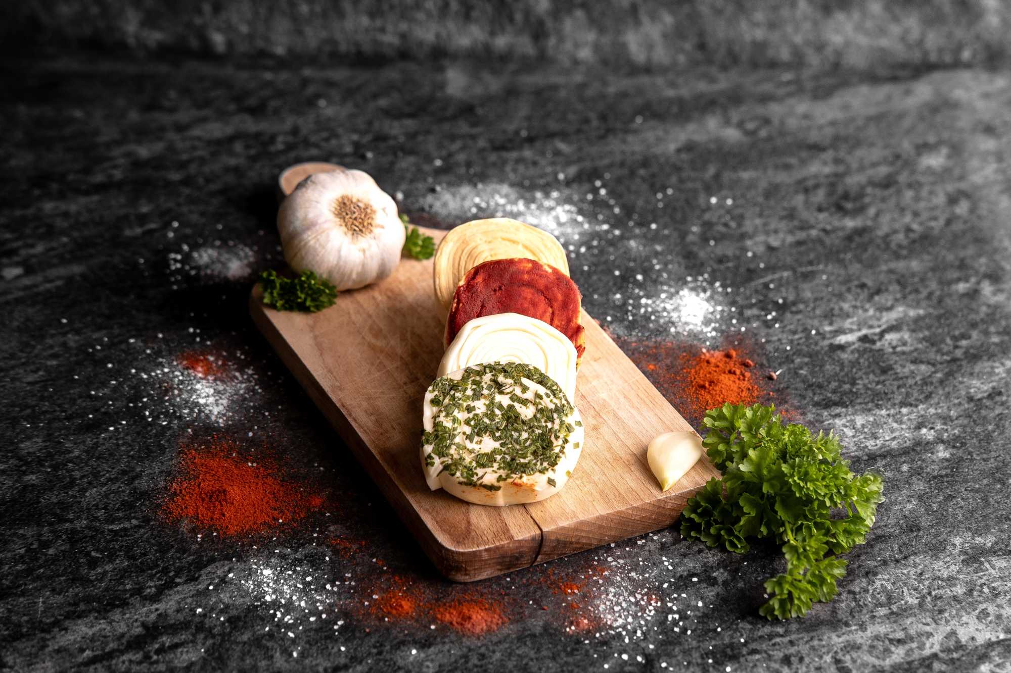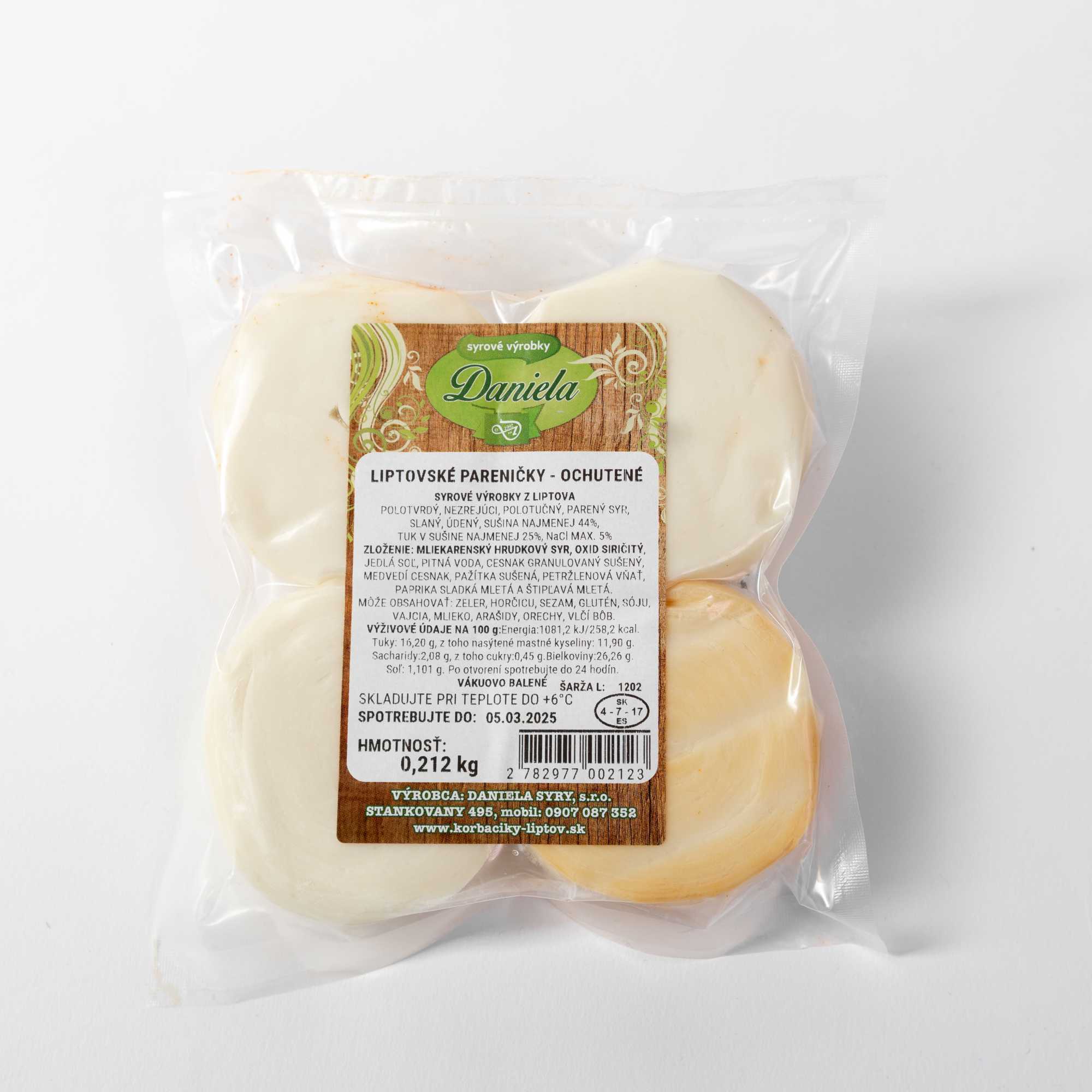 Zloženie: mliekarenský hrudkový syr, oxid siričitý, jedlá soľ, pitná voda, cesnak granulovaný sušený, medvedí cesnak, pažítka sušená, petržlenová vňať, paprika sladká mletá a štipľavá mletá.
